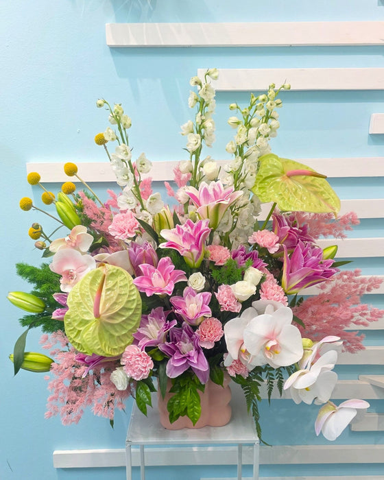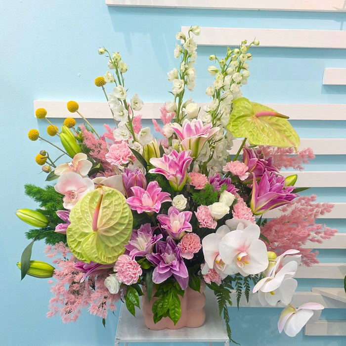 Our "Luxe Lily Garden" combines exquisite double petal pink lilies with soft pink carnations, elegant white phalaenopsis orchids, and distinctive green anthuriums. Beautifully presented in a charming pink vase, this grand arrangement brings joy to any occasion—whether celebrating a birthday, new home, special achievement, or simply showing someone you care. A thoughtful gift that speaks volumes through its natural beauty.