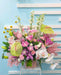 Flower Used - Fresh Double Petal Pink Lily, Pink Carnation, Green Anthurium, White Phalaenopsis, White Delphinium, Filler and Foliage, Pink Square Ceramic Vase included.