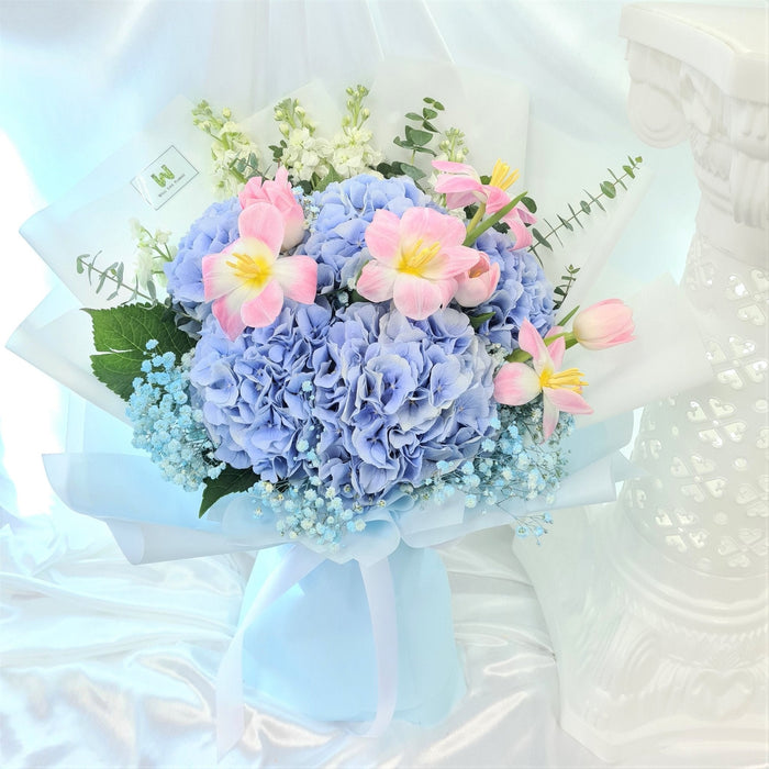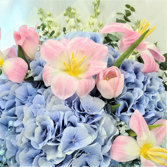 Flower used - Fresh Blue Hydrangea, Pink Tulip, Blue Baby's Breath, Filler and Foliage.