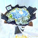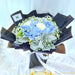 Elegance meets simplicity with this stunning hand bouquet showcasing beautiful blue hydrangea paired with pristine white carnation. A classic combination that exudes charm and sophistication, making it perfect choice for any special occasion.