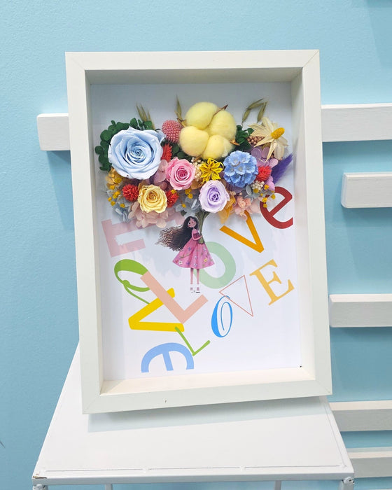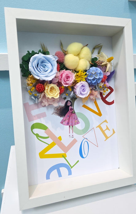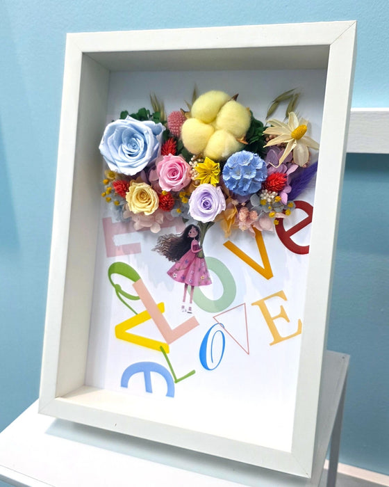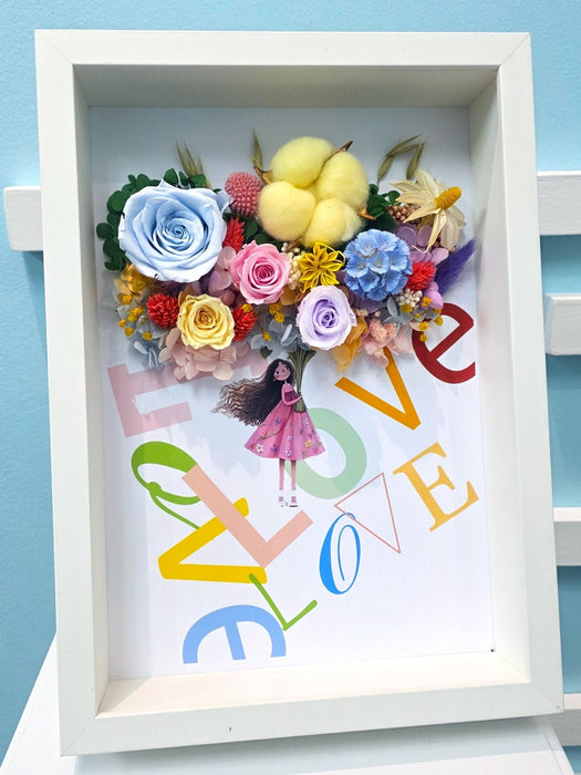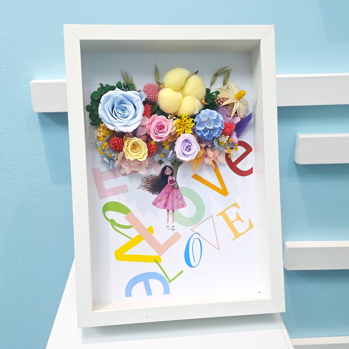 Unfading Love is the perfect anniversary or birthday gift that will last a lifetime. This preserved floral artwork features a stunning combination of a preserved Rose, Cotton, and Hydrangea, elegantly displayed in a frame. Show your love with this timeless and thoughtful gift.